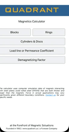 Dank der führenden Experten von Quadrant und dem Einsatz der Simulationstechnologie Finite-Elemente-Analyse (FEA) konnten wir eine mobile APP entwickeln, die eine bequeme Berechnung der Magnetkraft (F), des Permeanzkoeffizienten (Pc) und des Entmagnetisierungsfaktors (N) für rechteckige Magnetformen, axial magnetisierte Ringe und axial magnetisierte Zylinder erm?glicht.